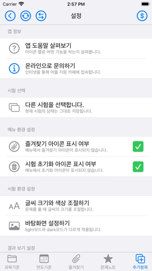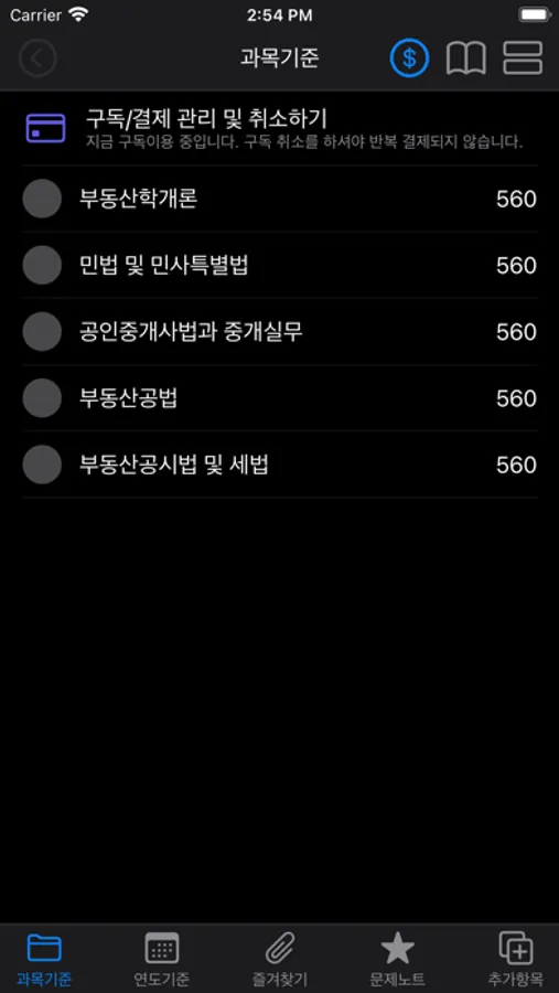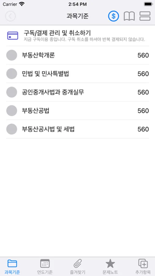 탭바에서 과목별 보기와 연도별 보기를 선택할 수 있습니다.