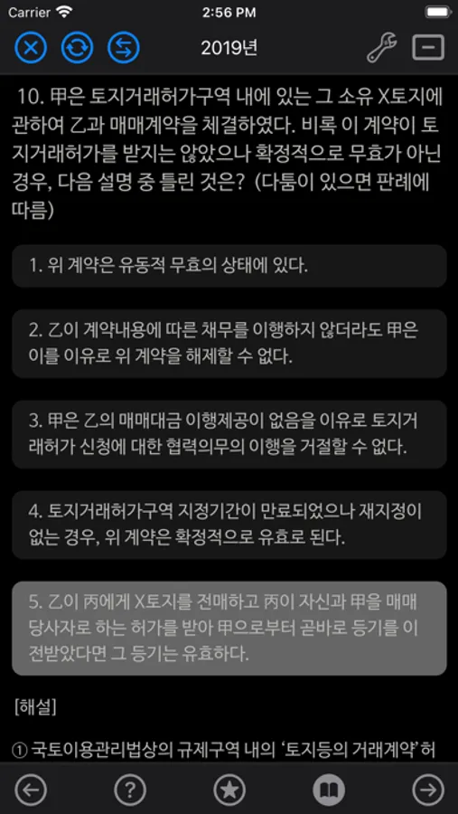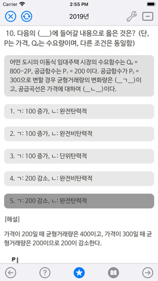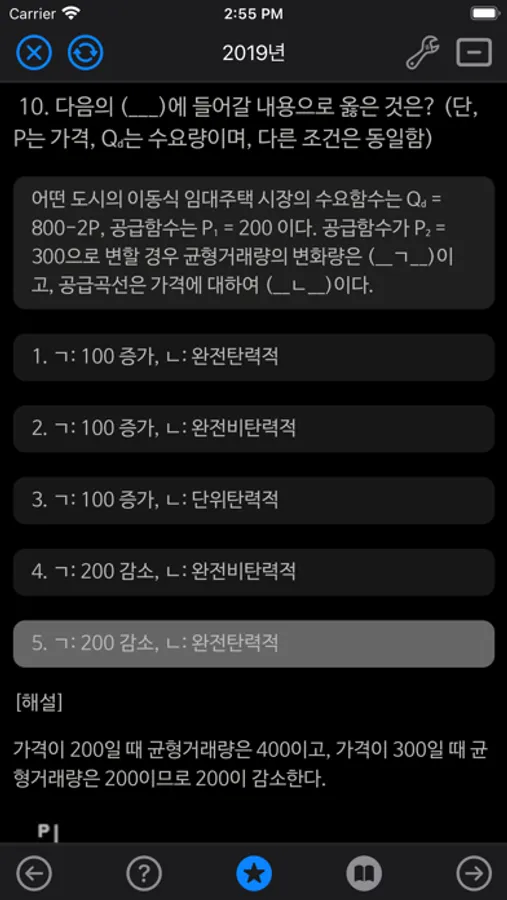 학습모드에서는 정답을 빨간색으로 보여주며 해설 이용시 하단에 해설도 같이 나타납니다.