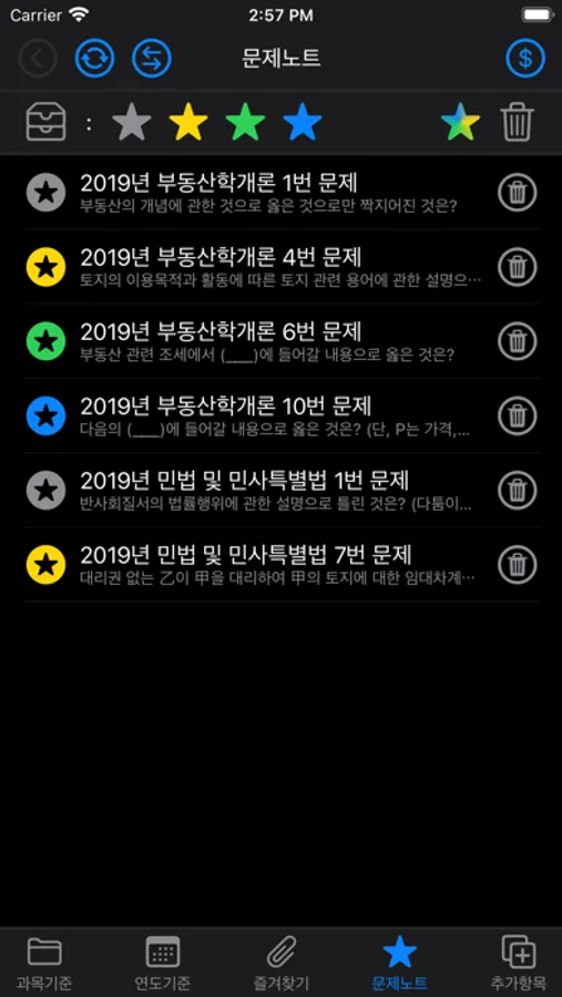 과목별 보기에서 문제를 풀면 자동으로 연도별 보기에도 적용되며 그 반대도 마찬가지입니다.