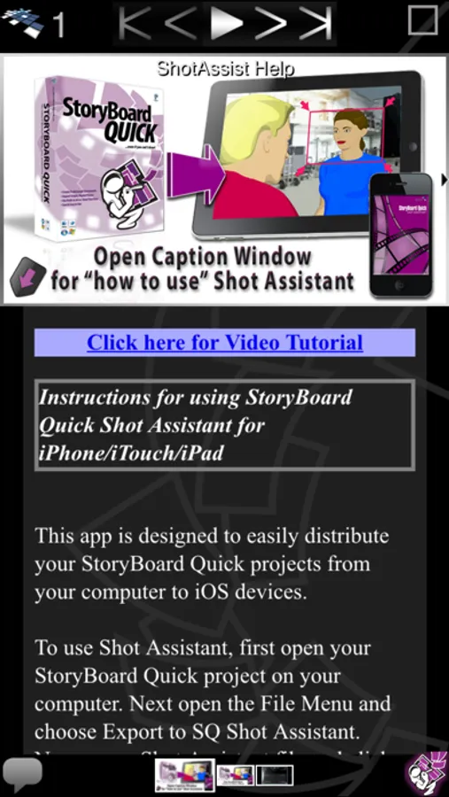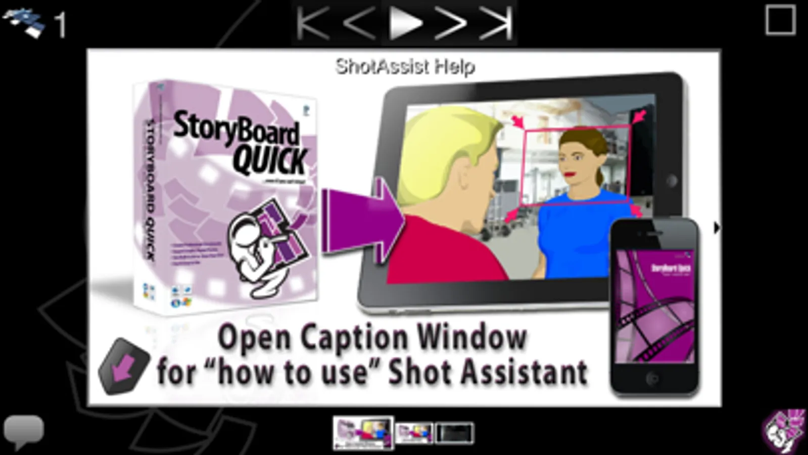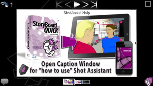 Show or hide your accompanying captions. With a single touch your captions appear to give you all the extra info, script or directors notes and even dialog from your original StoryBoard Quick project. Every storyboard has it's own caption to view.