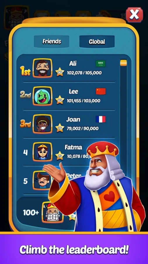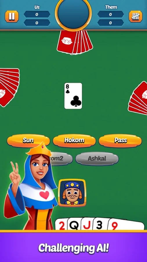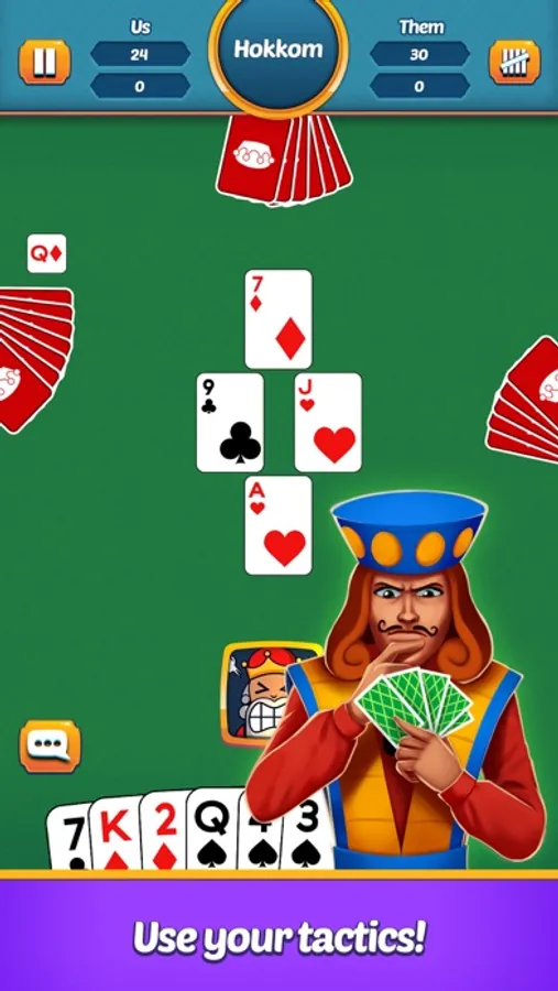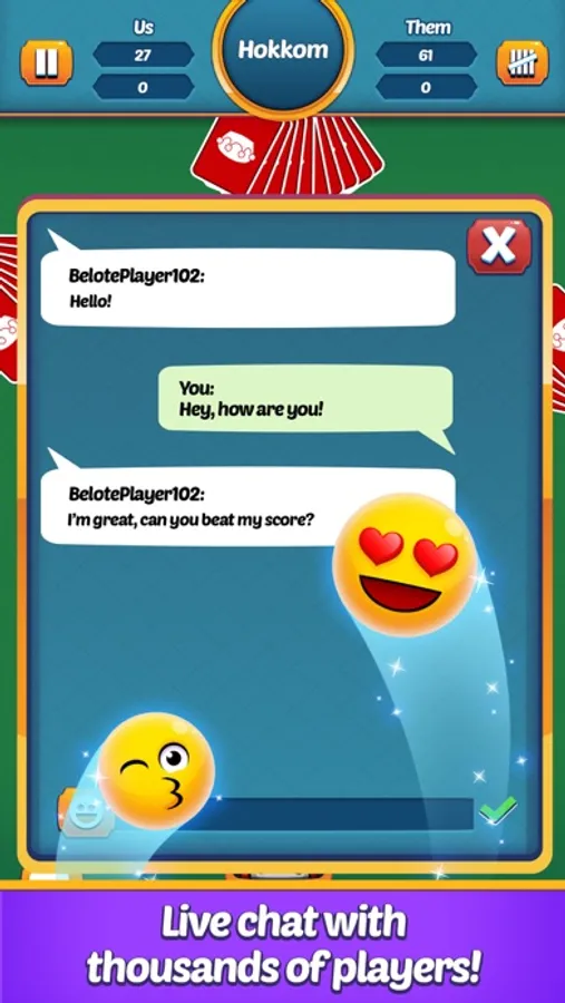 Become a part of the best Belote player community and join the chat rooms and meet Belote players from all over the world. Be the leader on the scoreboard and prove you're the best. However, you name it - Baloot, Belote, or Balut - the game is easy to play but one of the hardest to master. You can play anywhere and anytime with Belote Sheikh el Koba.