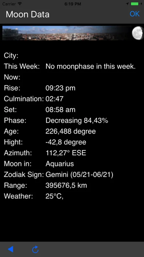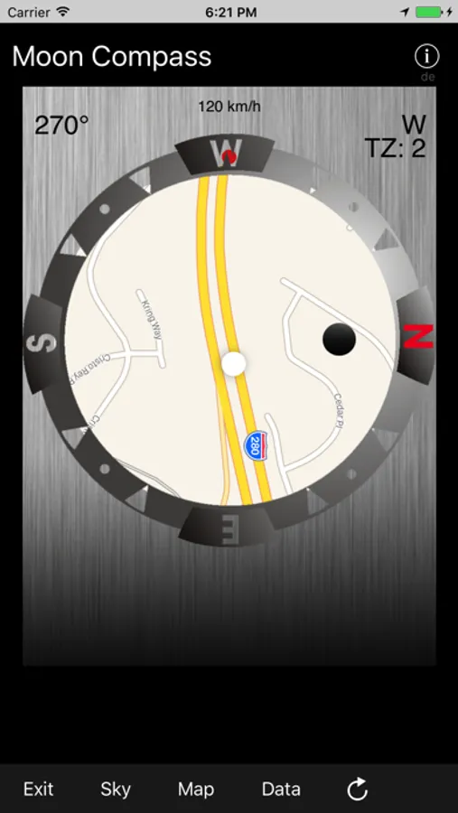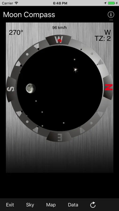 Find the moon with this Moon Compass. By determining the exact lunar data, depending on their location, the position of the moon is shown in the compass. At an azimuth of e.g. 90 ° rotation of the moon in visible to the east. A second view shows the moon and the compass on a map. Exact lunar data shows another window.