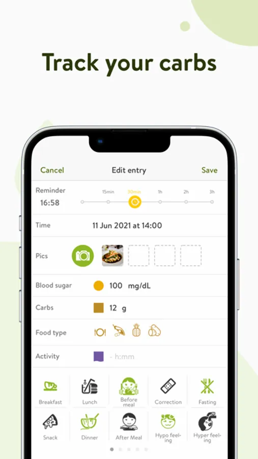• Meal photos: snap your meals to improve your carb counting.