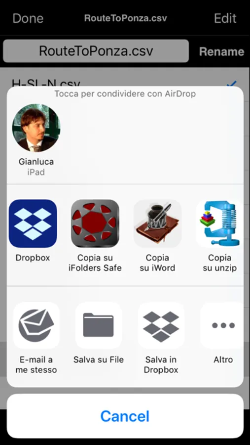 - "AirDrop", "iTunes File Sharing", "Open In", "iCloud Drive", "Dropbox", etc ... "SOS email" to share the recorded route data