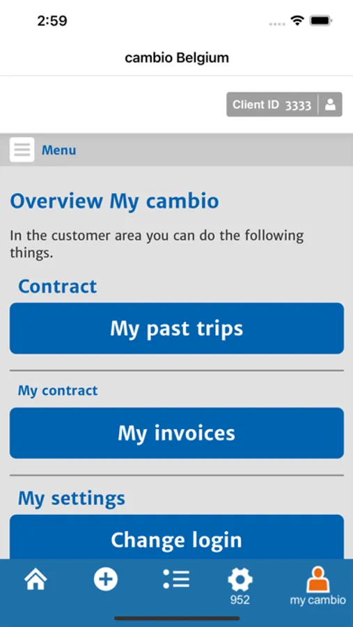 The section “Mycambio” keeps on expanding. You can now do the following: Look at your personal data, change your contact information and address, change your login data and contact customer service. You can also consult your invoices up to two years old, and a trip list for the past 36 months. From now on you can consult your current user limit and purchase trip credit online if needed.
