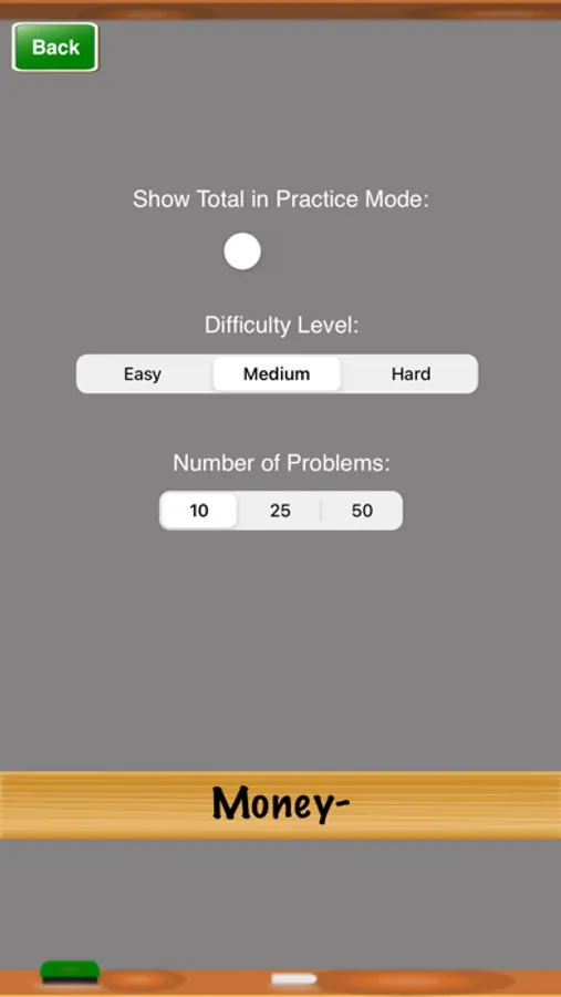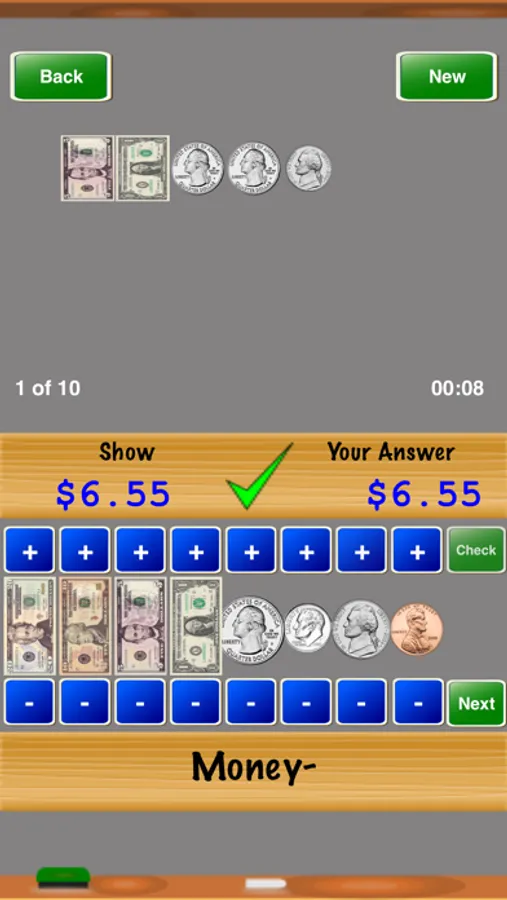 Money- is a great way to practice counting money. Select the difficulty level and number of problems in the "Settings" screen. Progress through the difficulty levels until you master counting money.