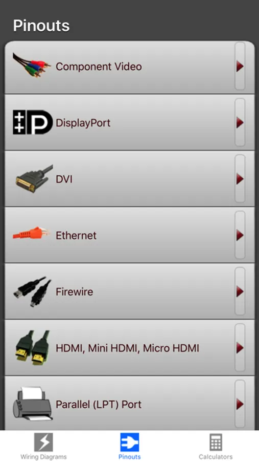 *Audio/Video Cable pinouts ( Component, DisplayPort, DVI, Ethernet, Firewire, HDMI/Mini HDMI/Micro HDMI, Lightning, LPT(parallel port), PS/2, RCA, Serial port, S-video, USB 3.0/Mini USB/Micro USB/USB-C, and VGA).