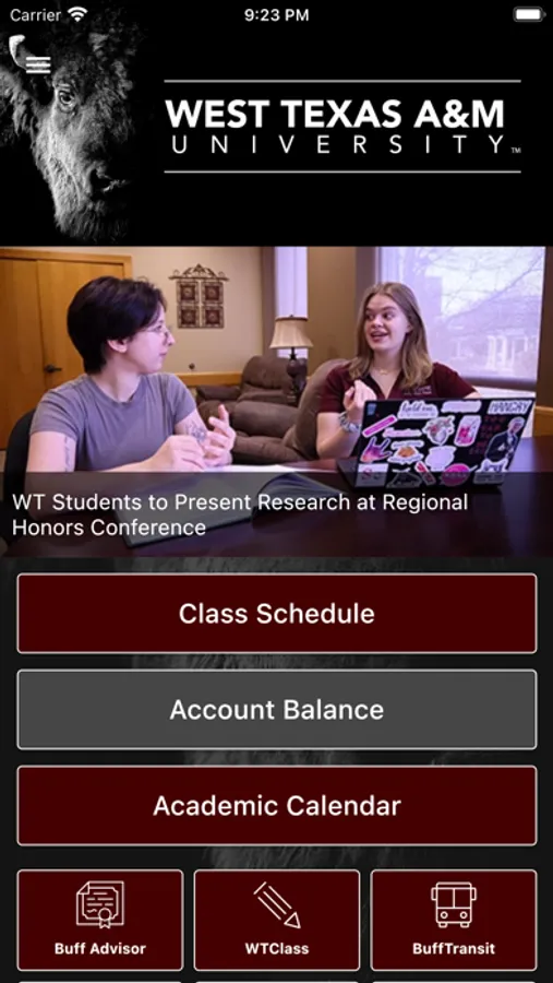 WTmobile provides easy access to resources for students such as BuffAdvisor, WTClass, and BuffTransit in addition to public resources like Campus News, Athletics, VR Campus Tour, the Cornette Library, and the WT radio station, KWTS 91.1. WTmobile is a great resource for current and prospective students, faculty, staff, and even parents and community members.