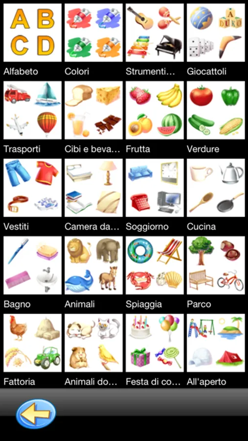 • 24 categories: Alphabet, Colors, Shapes, Numbers, Body, Clothes, Animals, Farm, House, Park, Beach, Food, etc...