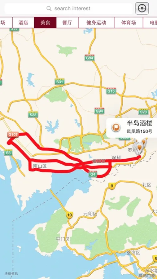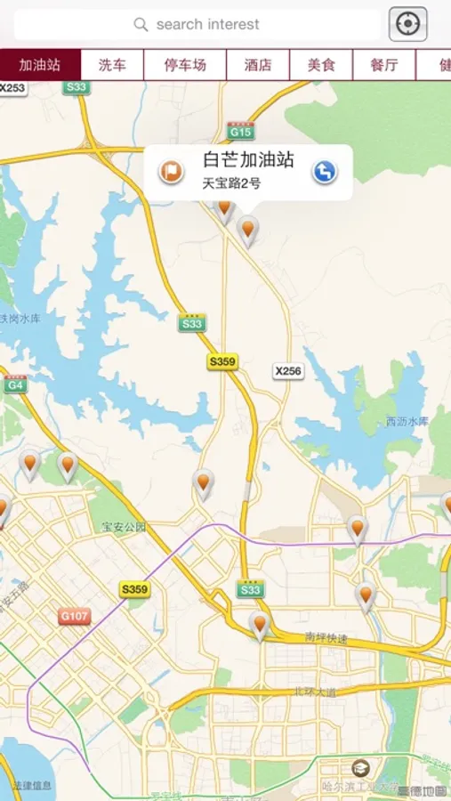 1.show gas station car wash parking hote food restaurant gym stadium movie theater KTV cafe bar bank atm nearby you