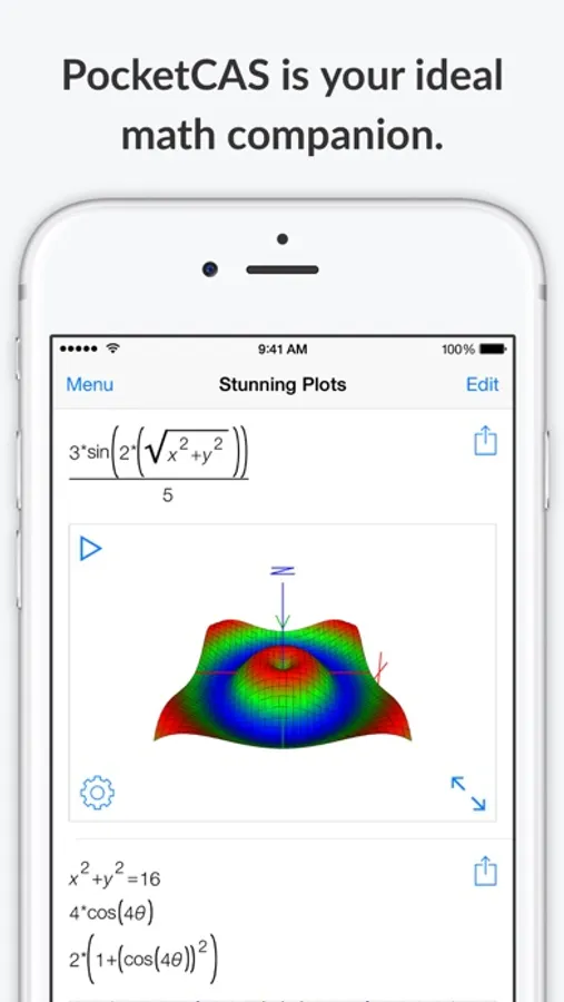 - 3D Plots: PocketCAS draws stunning 3D plots! Supports x-y cartesian plots, parametric area plots and parametric line plots.