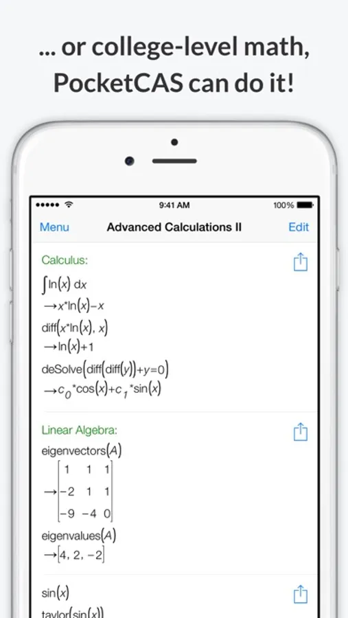 - Offline computation: PocketCAS doesn't need an internet connection to calculate results.