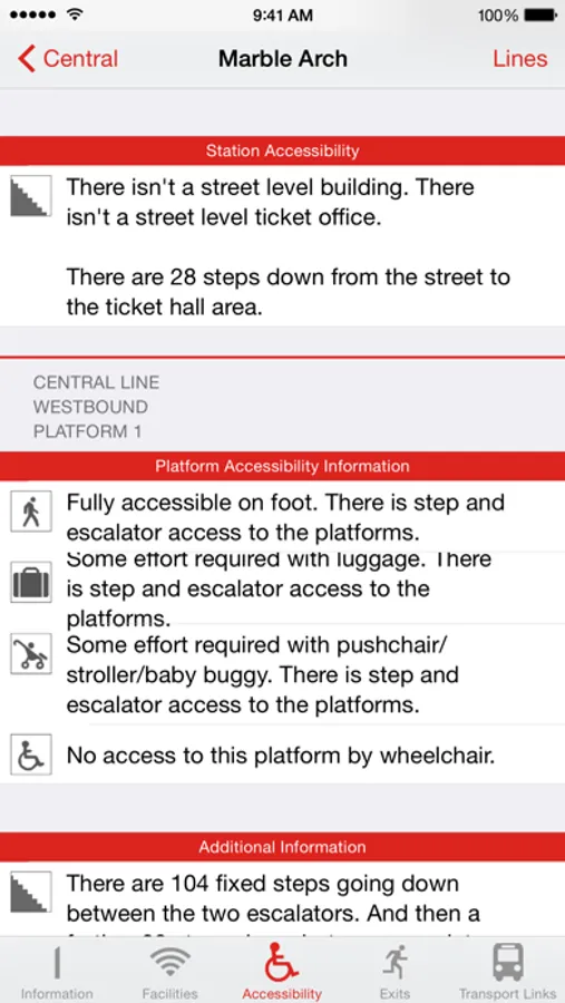 • Accessibility information - Steps count, lift availability, measurements of gaps onto trains and loads more essential information for wheelchair users, parents with buggies or just those with heavy luggage.