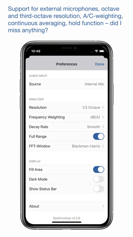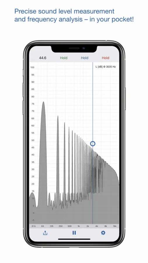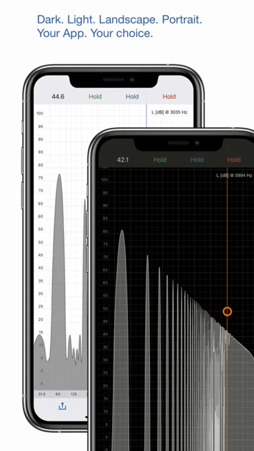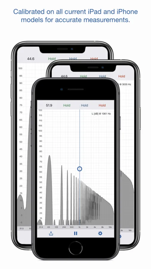 Analyze, measure, compare and save sound spectra captured with the internal microphone or any other audio source connected to your iOS device. The built-in microphone calibration for iPhone and iPad even allows to measure absolute sound pressure levels (SPL) with high precision.