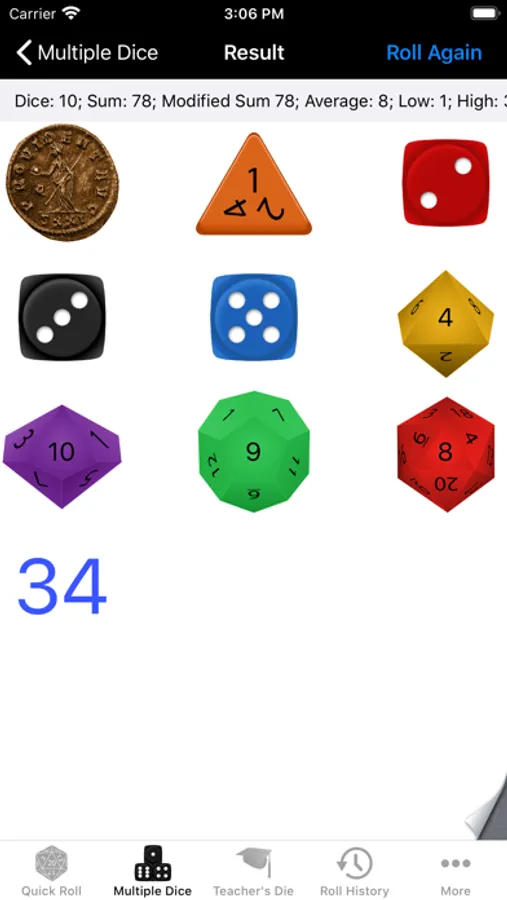 In multiple dice mode you can mix your dice together as you please. This mode has been designed with Warhammer in mind, and you can easily filter the dice at the touch of a button. The remaining dice can be rolled again to find out how many enemies you wound. Stats, such as average and the sum, are displayed for each roll saving you counting on screen. Buttons are provided to remove the highest or lowest rolls, as well as any range in between.