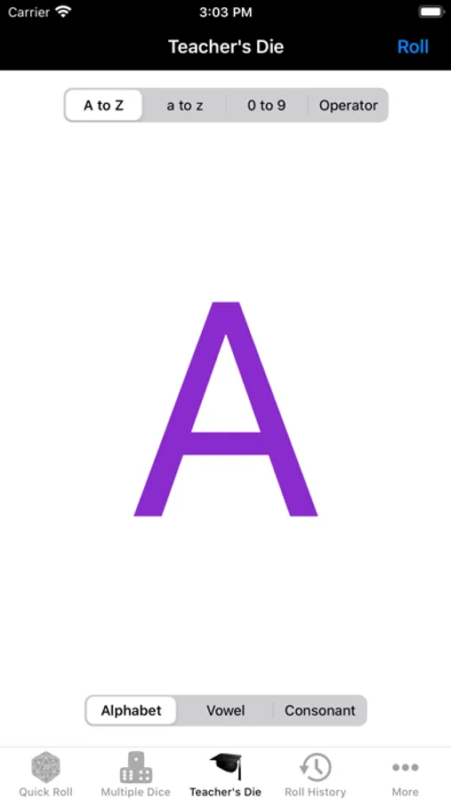 Handy for the classroom, this die will be helpful for Maths and English. You can use it to randomly pick letters, numbers and mathematical operators. When picking letters you can specify if they are upper or lowercase, and also pick between vowels and consonants.