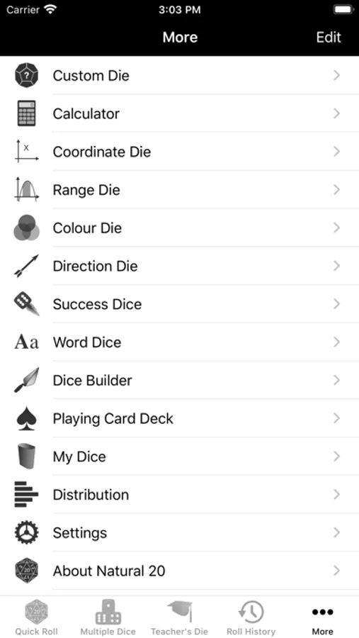Natural 20 has fifteen screens of features, to help you manage your dice. Here's a brief description of them.