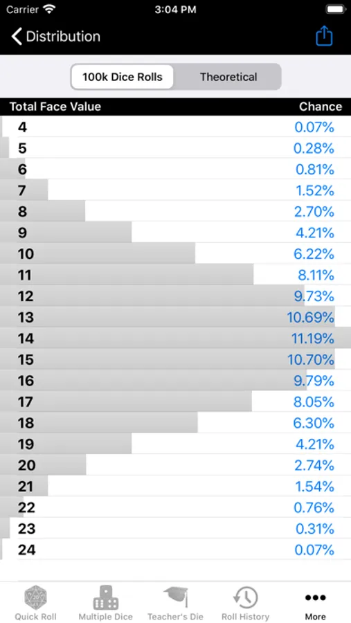 Distribution allows you to create probability distribution plots for specified dice. These will show you the percentage chance of rolling a particular face value, and you can compare actual rolls against theoretical results. However, large numbers of dice can take a long time to calculate for theoretical plots.