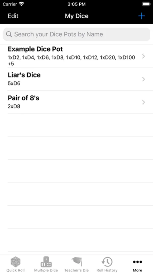 My Dice allows you to save your own collections of dice, along with a description and optional modifier. These can be easily searched through, and rolled from a single tap.