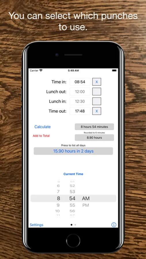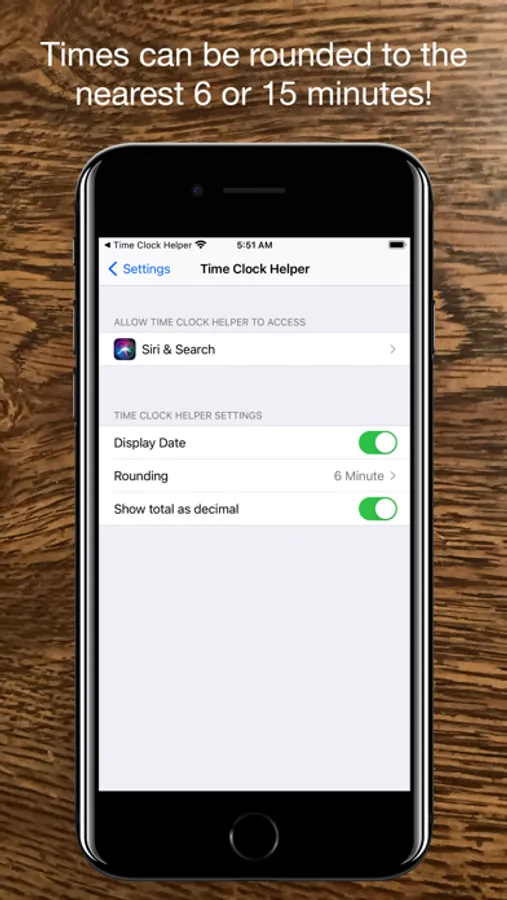 This app also allows the option to select different rounding options. Many work places round to the nearest 6 minutes, or 15 minute increment and this app now allows that in it's calculations. To change options, simply press the setting button and change the settings, or go into the device settings and change it for the app.