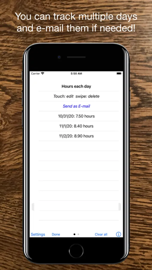 In the days box you can scroll up and down to view all the days recorded. You can also delete days by pressing on them and answering the prompt. If you want to clear them all press the clear all button on the bottom. If you would like to e-mail the times to someone press the e-mail button. Press done when you are finished to return to the entry screen.