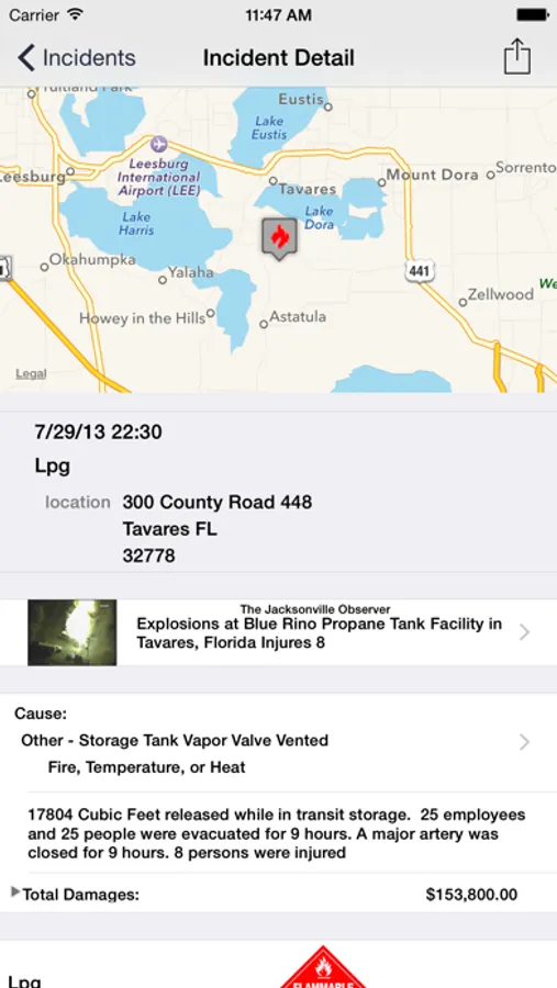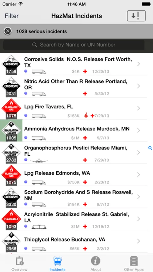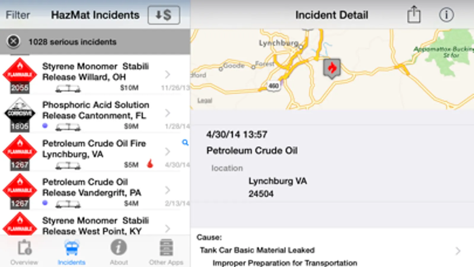 Industries regulated by Department of Transportation's PHMSA (Pipeline and Hazardous Material Safety Administration) Office are required to report incidents which meet or exceed established reporting criteria. Incidents listed in this app are from the detailed incident reports required within 30 days of a reported incident while transporting Hazardous Material by Aircraft, Highway, Train or Vessel.