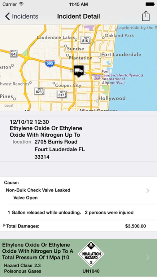 The viewable detail of each incident includes: a map, incident cause, shipper & carrier names, a result summary and material specific information. Information is available for materials that are listed in the NIOSH Pocket Guide and Emergency Response Guidebook (ERG). Data presented includes material physical descriptions, synonyms, IDLH, incompatible/reactive materials and the corresponding ERG guide's name/number.