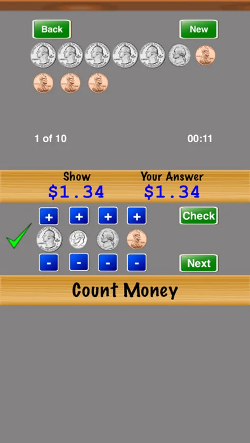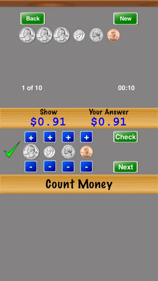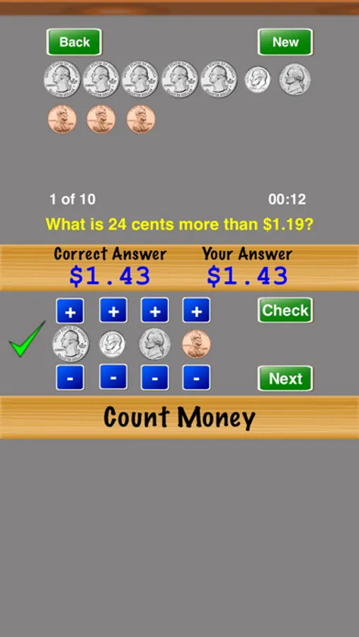 Count Money is a great way to practice counting money. Select the difficulty level and number of problems in the "Settings" screen. Progress through the difficulty levels until you master counting mone