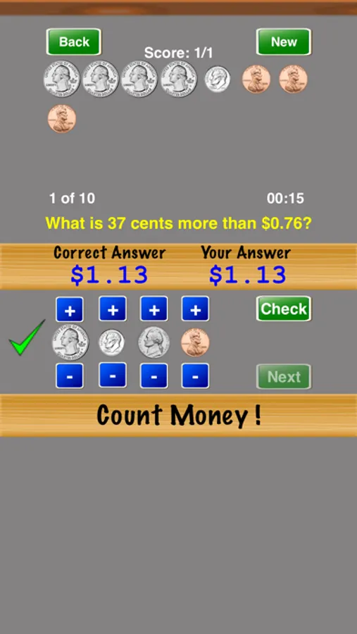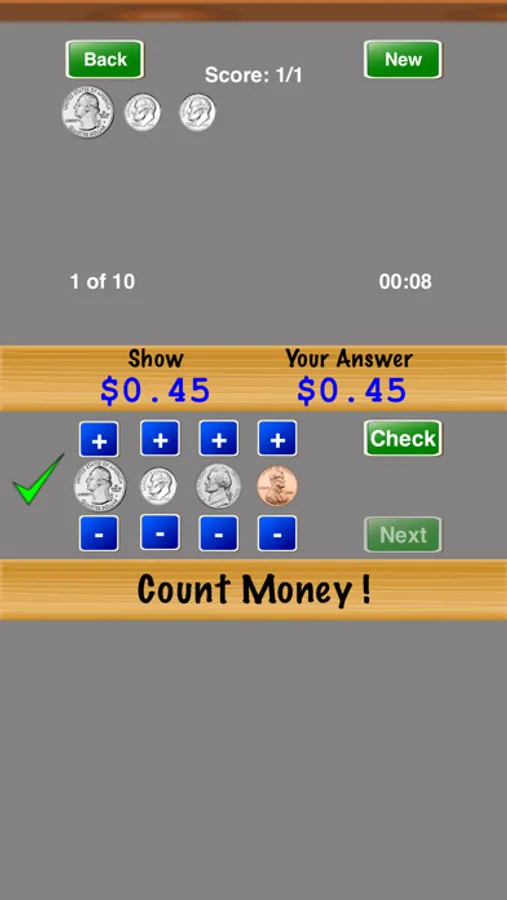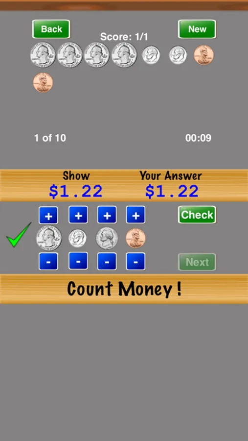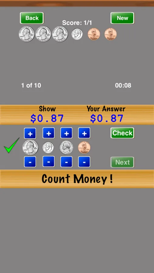 Count Money ! is a great way to practice counting money. Select the difficulty level and number of problems in the "Settings" screen. Progress through the difficulty levels until you master counting money.