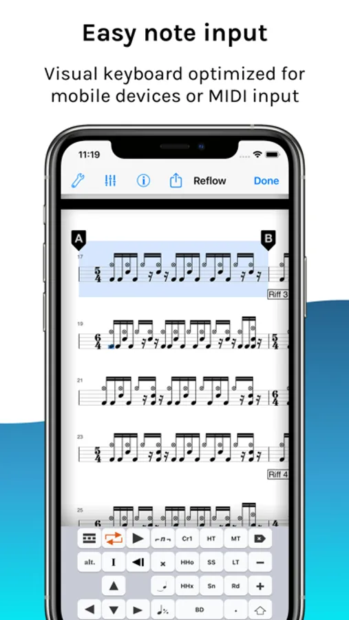 Reflow can be used to compose and practice any song for Guitar, Bass, Drums, Piano, Banjo, and many other instruments as long as it uses Standard Notation or Tablature.