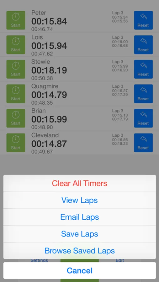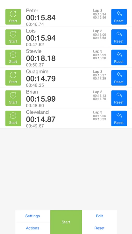Timers can be started, stopped, or reset individually, or via a master start/stop button.