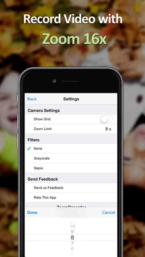 Zoom Recorder lets you zoom in and zoom out in real time when recording videos. You can record awesome videos in FULL HD quality (1080p) with smooth zooming.