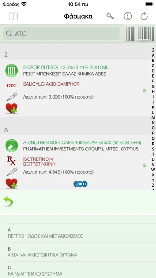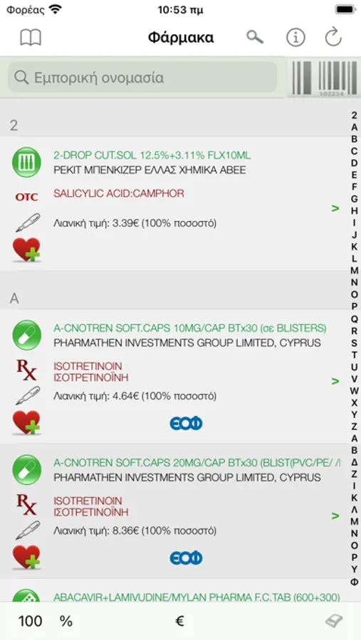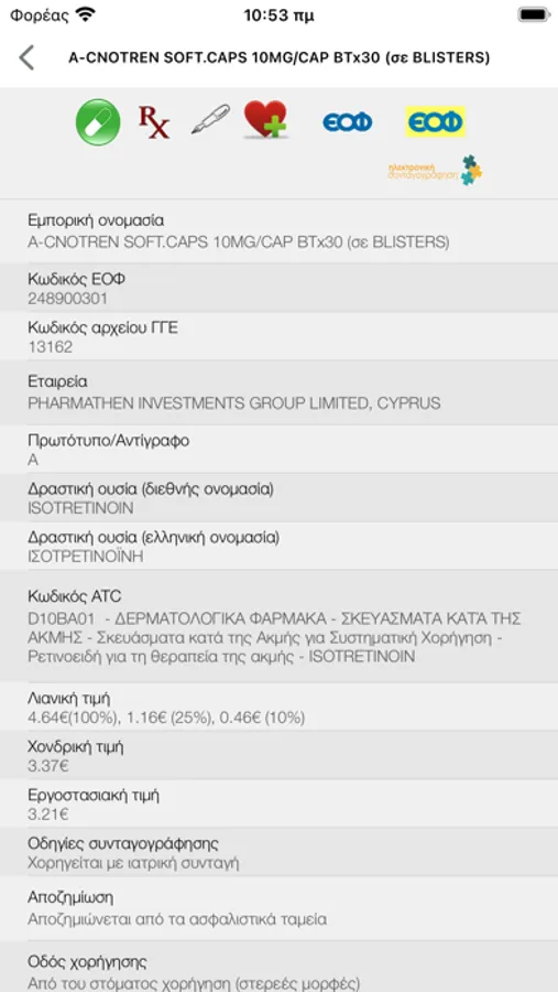 1)Χρήσιμες πληροφορίες όπως φαρμακευτική ουσία (ελληνικά και αγγλικά), κωδικός ΕΟΦ, ΑTC, Eταιρεία, Τιμές (Λιανική,Χονδρική,Νοσοκομειακή)