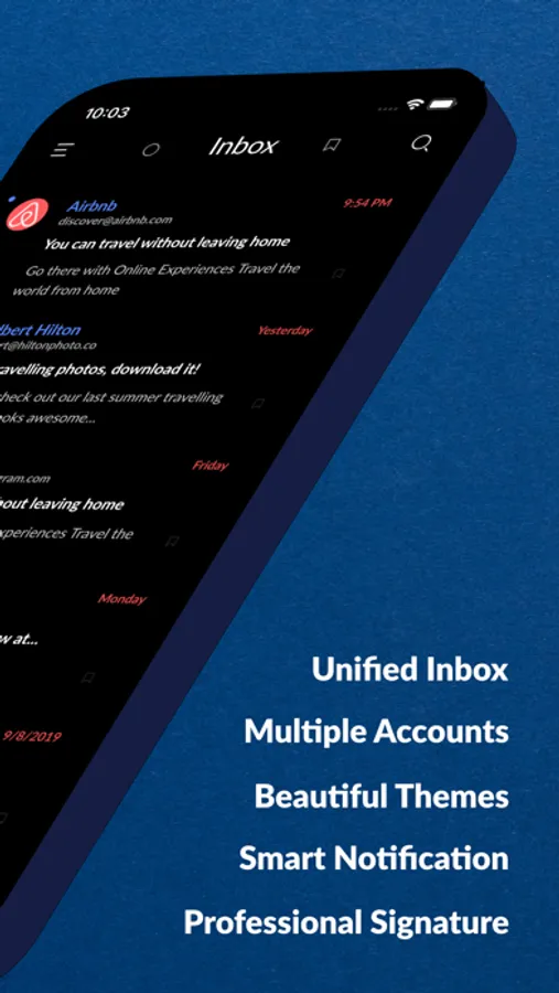 - Swipe action to delete, mark as read, mark as spam, reply, etc