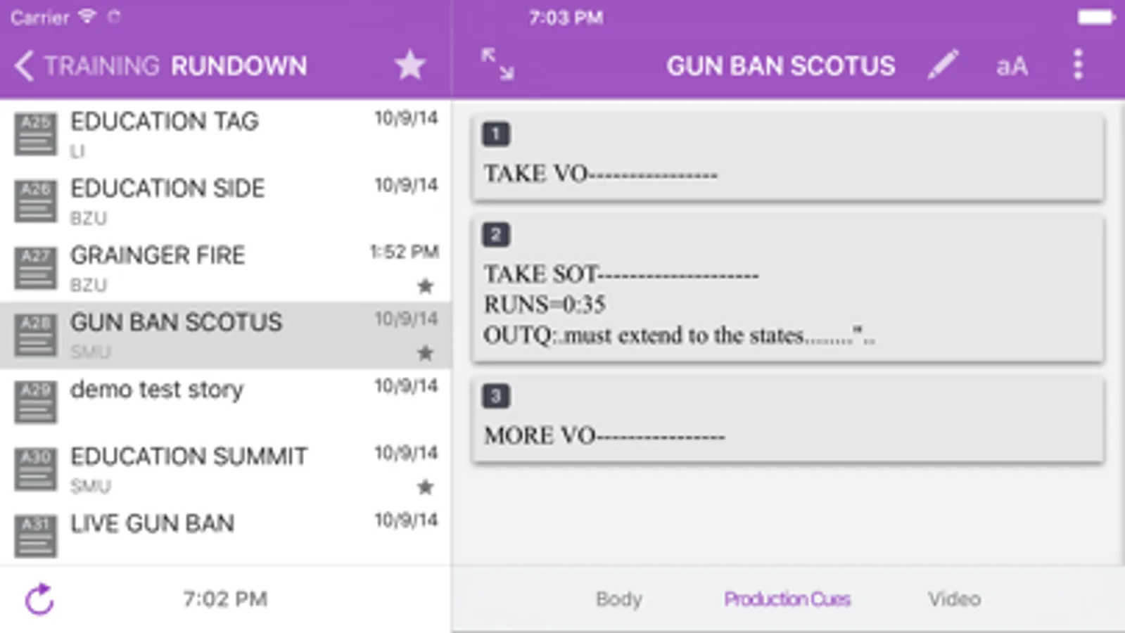 · Stories include normal text, presenter text, close captioned text, and production cues