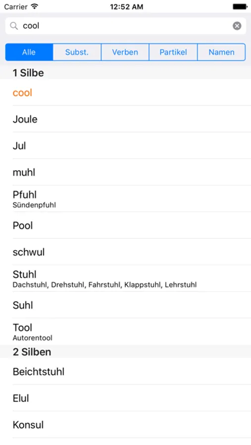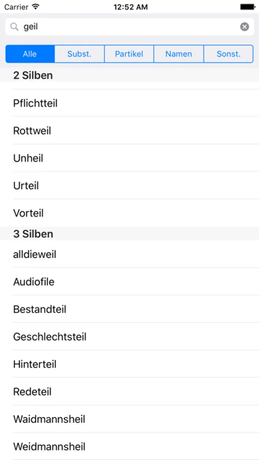 * Ergebnisse werden nach Silbenanzahl gruppiert