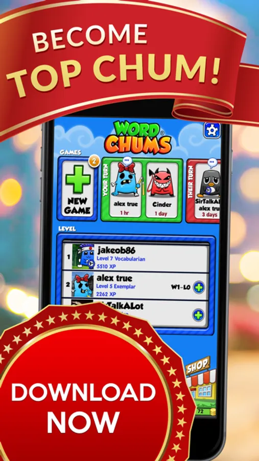 Earn experience points with each word played and level up to become King or Queen of the Chums. Show off your “wordly” prowess by climbing your way to the top of the weekly leaderboards.