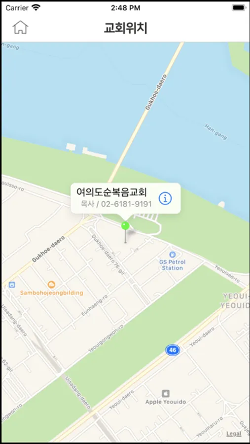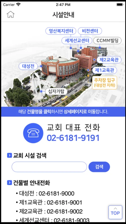 7. 기관소개 : 기관/건물별 시설안내 및 검색 및 지교회 및 성전 위치안내 서비스