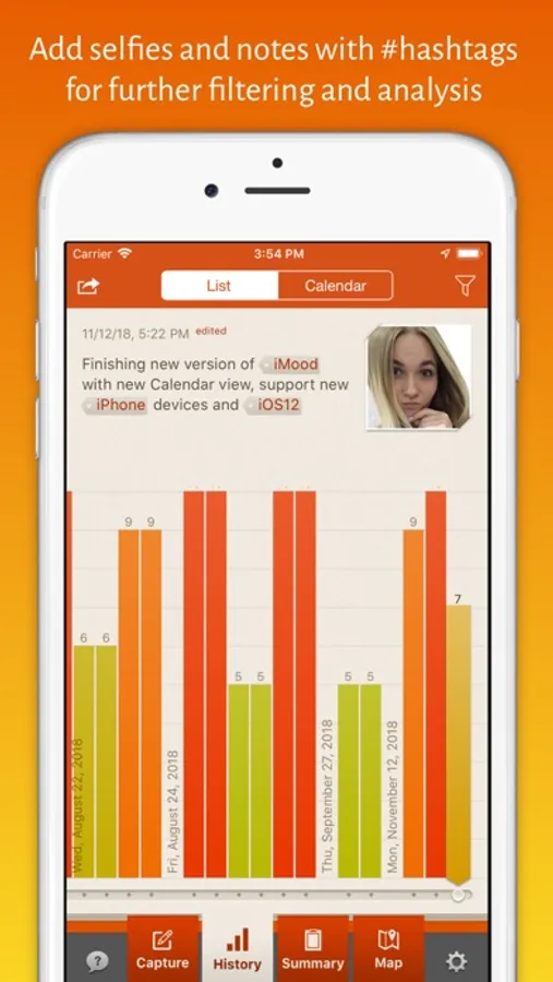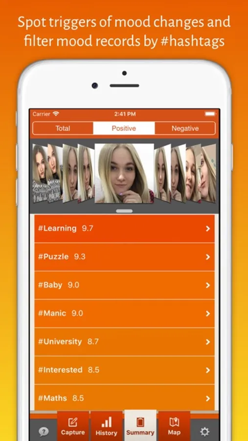 - Smart #hashtags system to establish associations between moods and experiences by adding #hashtags to records. Mark your emotions, people surrounding you, any other objects or activities with #hashtags. Examples: #angry, #surprised, #friends, #workout. iMoodJournal will show how your feelings and your surrounding affect your wellbeing in long term.