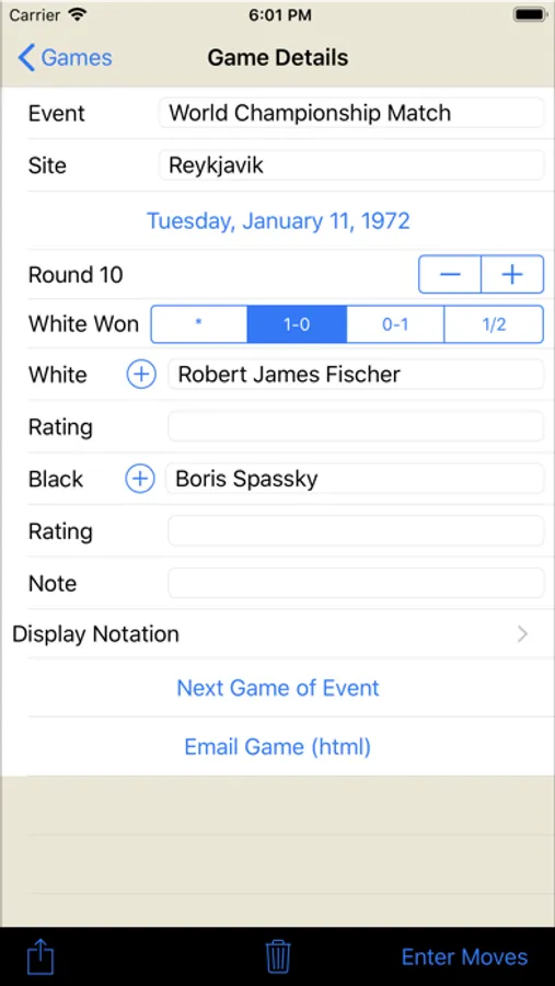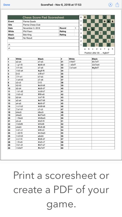 Keeping a score sheet is required for tournament games and essential in order to review your games to improve. A paper scoresheet distracts you from your game and they are prone to errors. Then the game needs to be manually copied into your chess game database. With Chess Score Pad there is no need to translate the move to the coordinates or risk forgetting to record a move. You simply drag or tap the piece to the new square. Then, after the game you can share the PGN file of the game and import it to your chess game database for analysis and review.