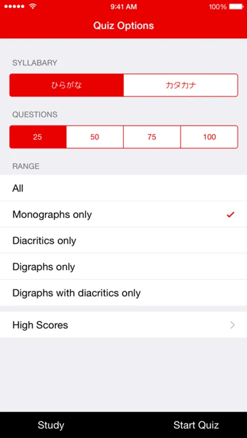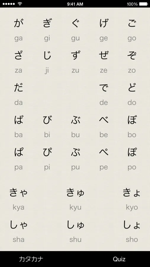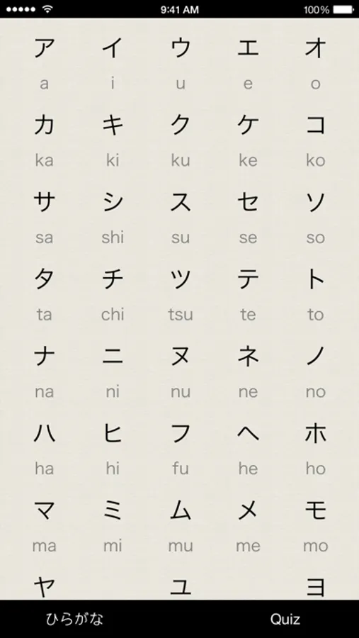 - Test yourself with 25, 50, 75, or 100 questions. Chose katakana or hiragana.