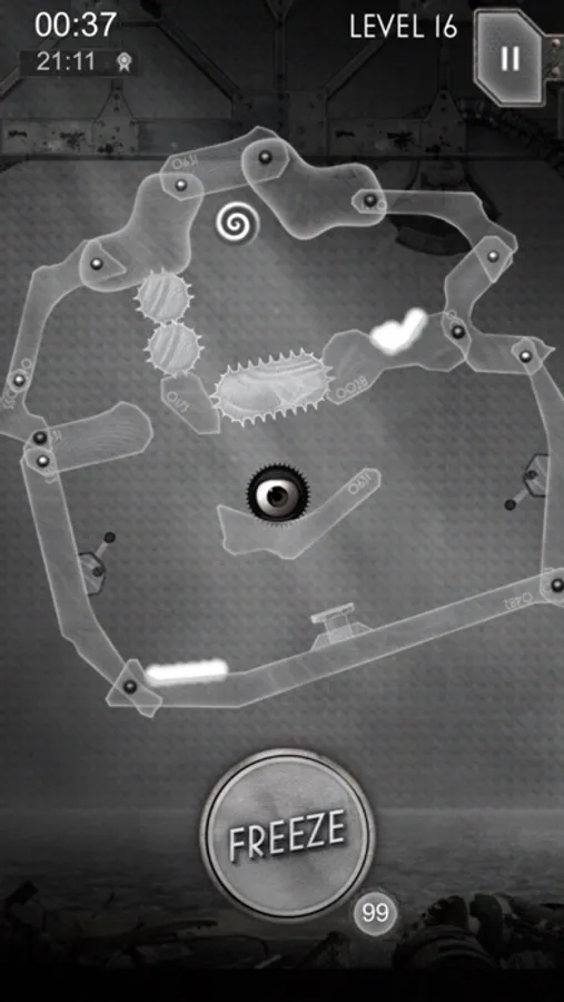 Solving the rotating, physics-based puzzles is easy; just use your finger to continuously turn the cell in both directions around our hero. Of course you also have to make clever use of the Freeze! button, which can overcome gravity. Sound simple? It is – at first...