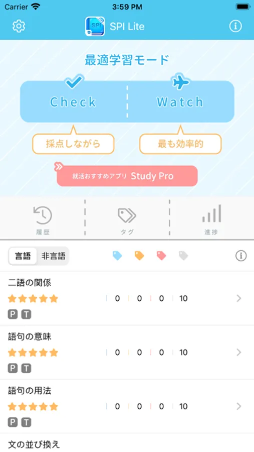 最適学習モードは、未学習の問題と苦手な問題が優先的に出題される、学習効果を徹底的に追求したモード。時間のない就活生には、必ず役に立つ!