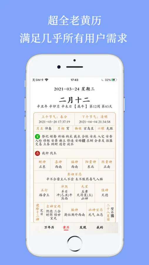 极速体验,快速查看公历、农历、黄历、节日、吉日、法定假日。