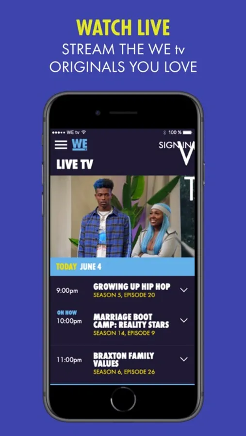 Sign in with your cable provider and get your WE tv fix whenever and wherever you want it! Find new favorites, stream Live TV, and stay current with the latest full episodes and video extras from WE tv Original Series. Full episodes are available in-season, with no login required for season premieres and video extras like trailers, sneak peaks and deleted scenes!