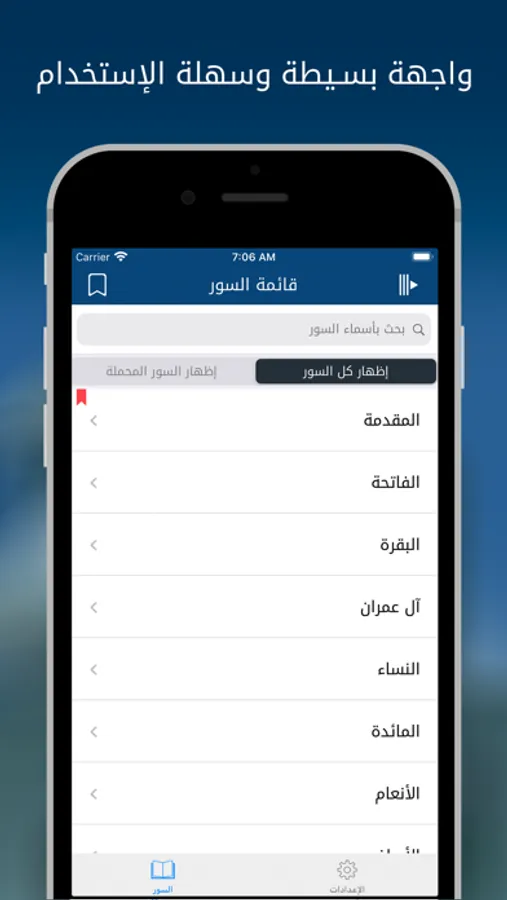 التطبيق ذو تصميم بسيط ومريح فبمجرد الضغط على السورة من قائمة السور تظهر لك الحلقات الخاصة بهذه السورة مرتبة حسب ترتيب الآيات.