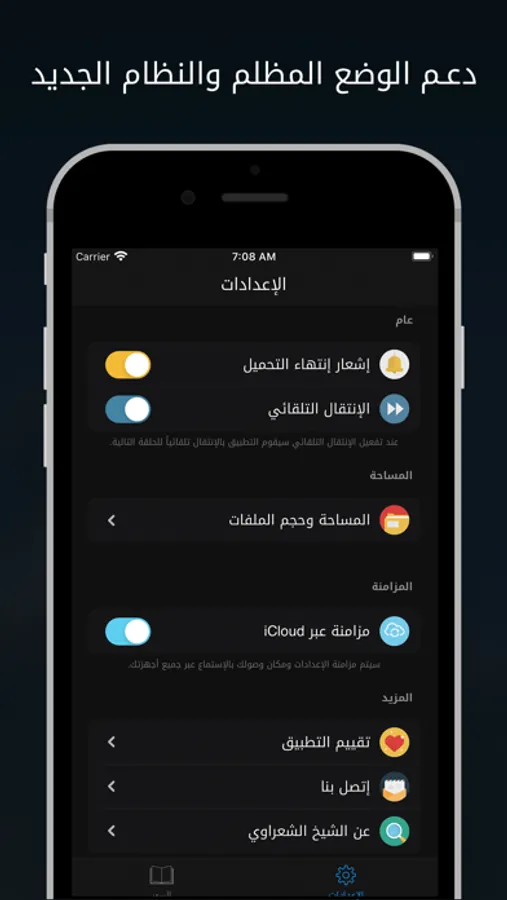 - إمكانية مزامنة الإعدادات والحلقة والوقت الذي وصلت إليه عبر الآي-كلاود، فمثلاً إذا وصلت إلى حلقة معينة على جهازك الآيفون وفتحت التطبيق على جهازك الآيباد ستخرج لك رسالة تسألك إذا كنت تريد المتابعة من آخر مكان وصلت إليه.