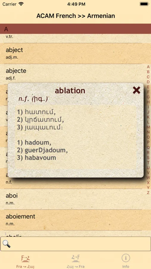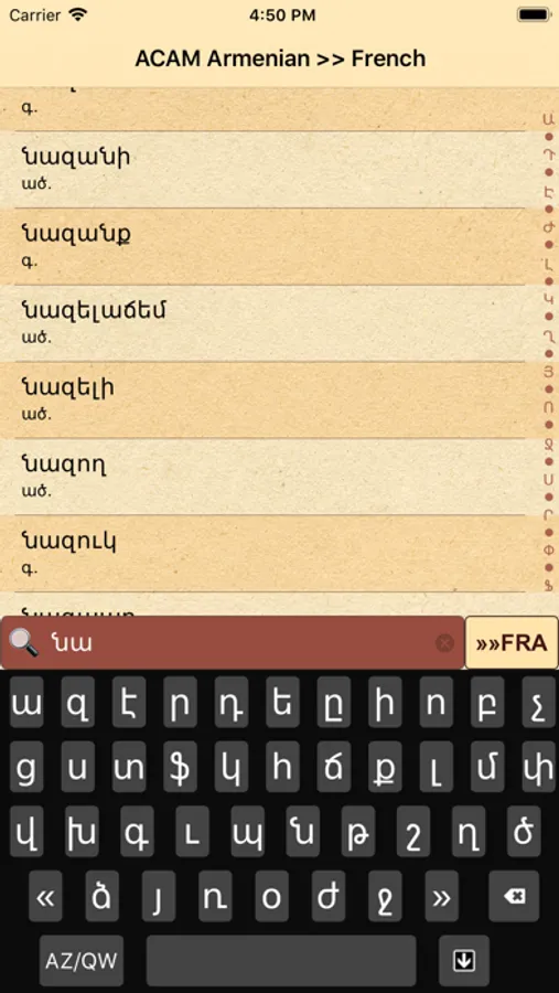 You have the possibility of entering Armenian words in phonetic transliteration; you can look for a word in Armenian by writing it in Latin letters.