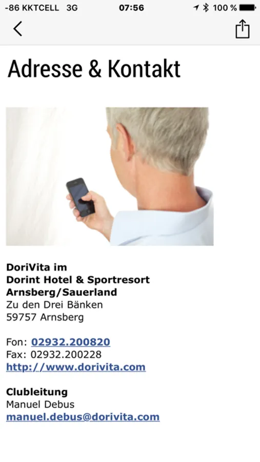 Informationen, wie Öffnungszeiten, Kontakt, Trainingstipps sind immer dabei und können sofort per Email zu Freunden geschickt werden.