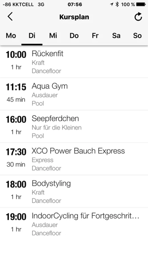 Direkter und aktueller Zugriff auf den Kursplan der DoriVita Sport & Wellness Clubs von überall: Für jeden Kurs können Sie Details wie Zeit, Kursbeschreibung, Raum und Merkmale wie z.B. den Schwierigkeitsgrad einsehen.